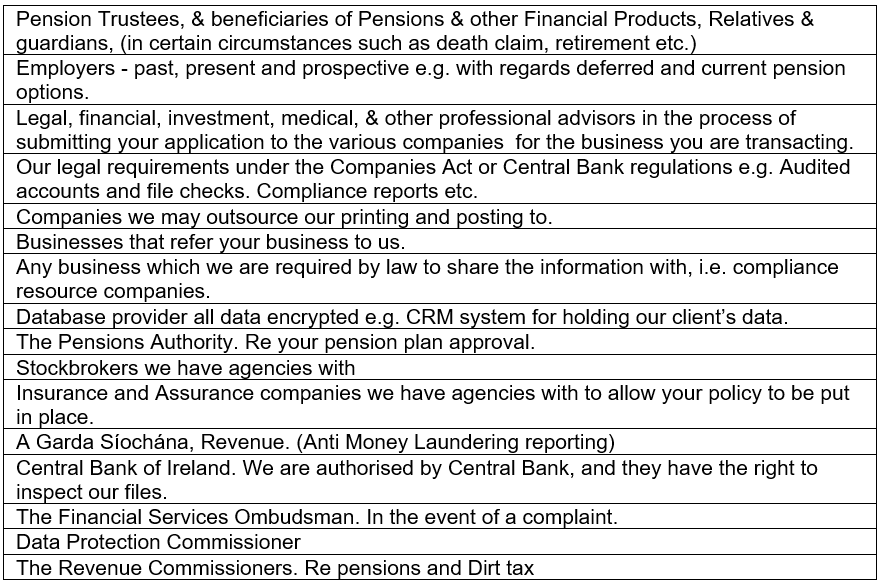 Our principal business is to provide advice and arrange transactions on behalf of clients in relation to Life, Pensions and Insurance based Investments. We provide our services from the selection of products provided by the Companies we have agencies with. We recommend the product that, in our professional opinion, is best suited to you. In providing this service to you we will need to obtain personal information from you the following outlines how we deal with this information and how it is used. Any questions or concerns you have can be addressed to us directly.